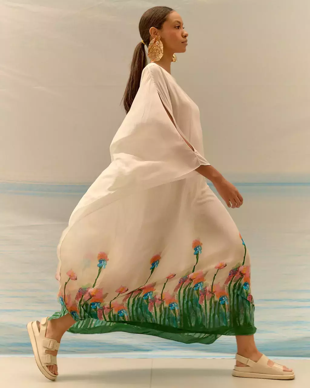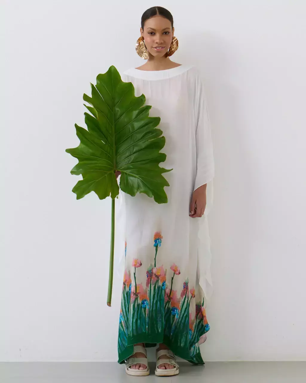 Kaftan longo com caimento fluido e estampa floral baseada na obra da artista Gio Freire.