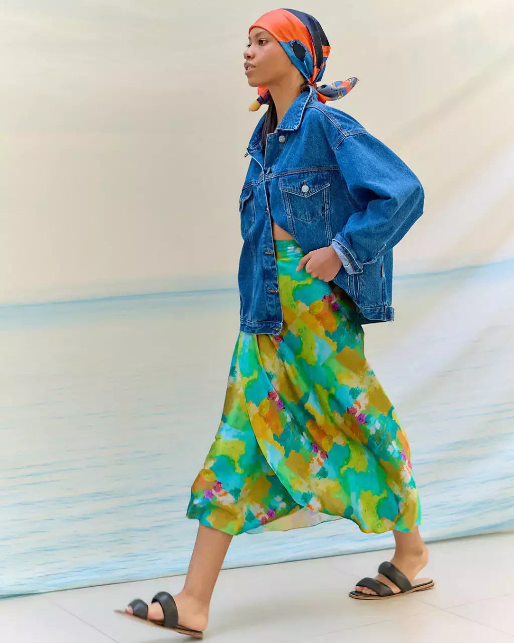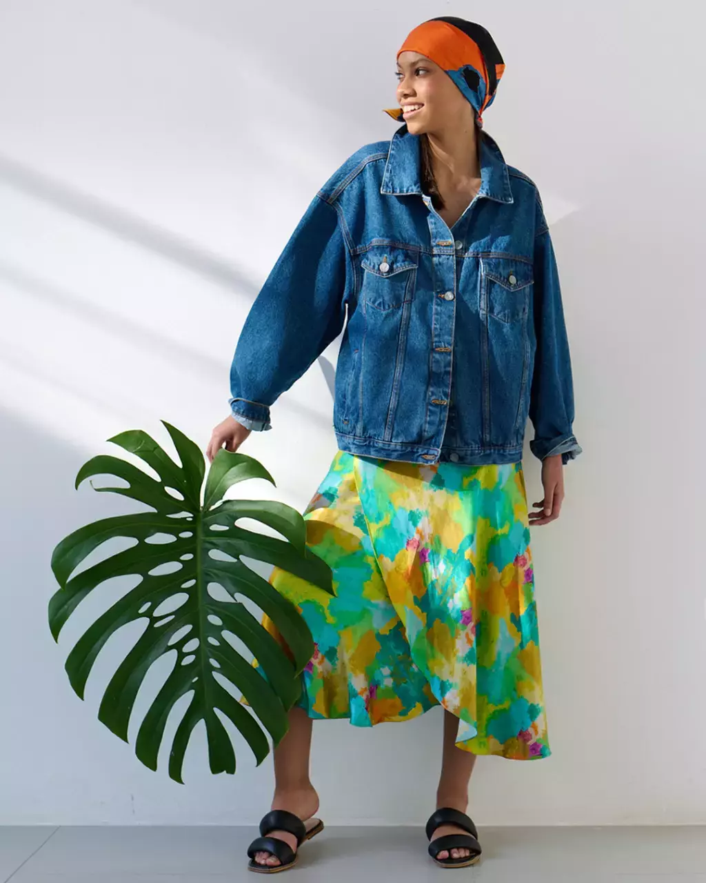 *Modelo 2 veste Pareô “Coelho da Páscoa”, Jaqueta Jeans e Lenço 90 “Tough Love”.